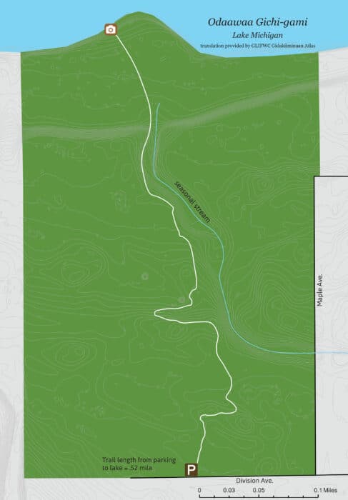 The preserve’s design emerged from these values. A universally accessible half-mile trail now follows the natural rise and fall of the terrain, offering visitors a quiet woodland approach before opening to Lake Michigan’s horizon. Interpretive elements—including signage in Anishinaabemowin—highlight cultural connections and invite visitors to see the land not only as a destination, but as a story still unfolding.