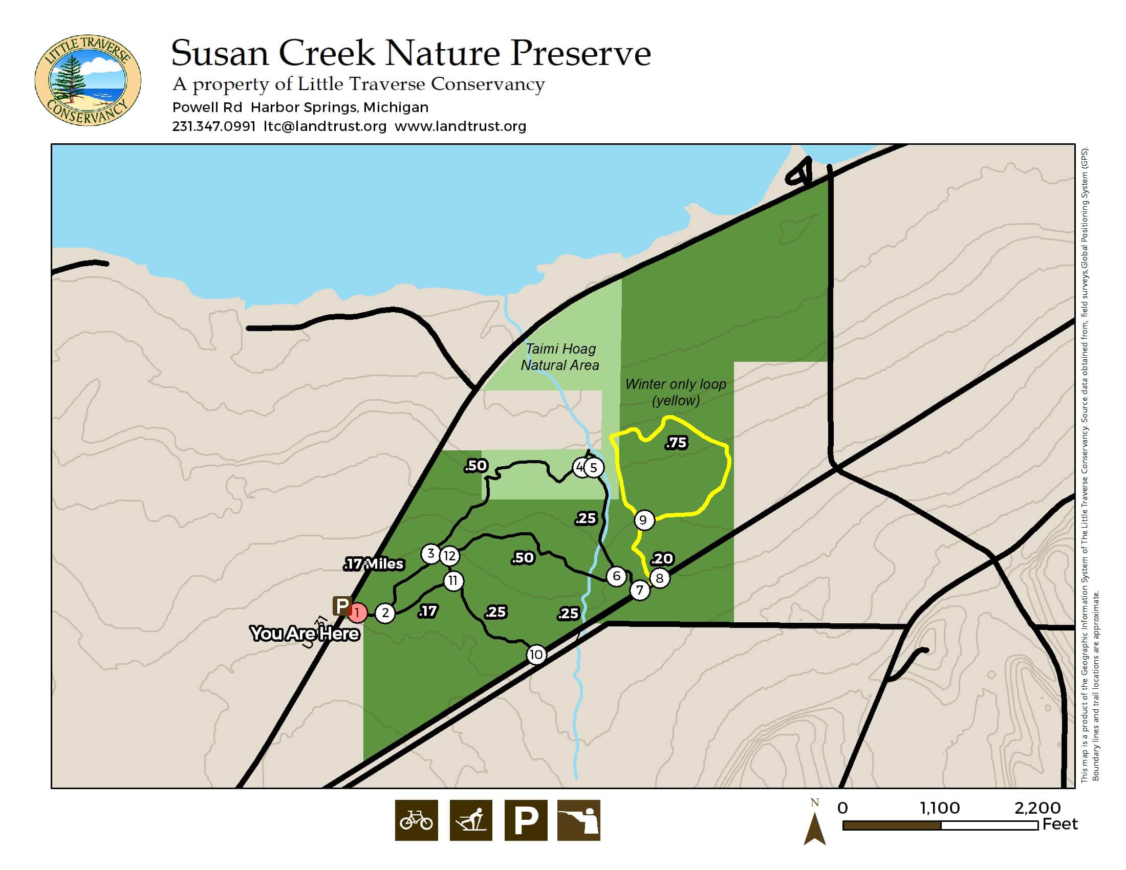 Four miles east of Charlevoix city limits and 11 miles west of Petoskey’s intersection of US-31 and US-131, the entrance to Susan Creek is located directly off of US-31, 0.6 miles south of Big Rock Road (the access to the Big Rock Restoration Site). The preserve sits across from the Little Traverse Wheelway.